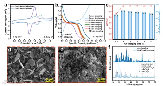 图2. a) 在1 mV s⁻¹扫速下,含与不含Pt的poly(1,6-DHN)@TMBQ混合正极扣式电池的CV曲线对比; b)在2 mA cm⁻²电流密度下采用烧杯电池,poly(1,6-D)@TMBQ-Pt/AC正极在不同空气充电时长后的恒流充放电(GCD)曲线及放电曲线; c) 空气自充电正极的开路电压(OCV)及容量恢复率随空气暴露时长的变化曲线; d, e) 正极分别在ZnSO4电解液中及空气中自充电后的SEM图像; f) 对应图(d)和(e)中两类样品的XRD图谱。
