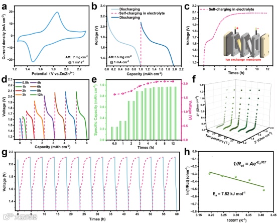 图3. a) 1 mV s⁻¹扫速下的CV曲线; b) 电池在Power-charged与Self-charged后的放电曲线对比; c) 电池电压随自充电时间的变化曲线; d) 电池在不同自充电时长后的放电曲线; e) 自充电容量及电压随自充电时间的变化规律; f) 在H2SO4的三电极体系中,正极随温度变化的EIS图; g) 高电压电池自充电功能的循环稳定性测试; h) 利用图(f)中的数据进行线性拟合,推导反应活化能。