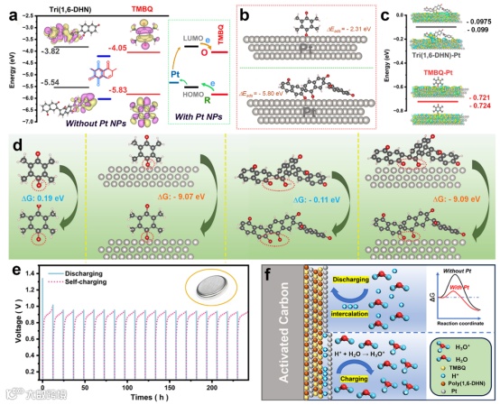 图4. a) Tri(1,6-DHN)与TMBQ分子的LUMO和HOMO能级及其分子轨道示意图; b) Tri(1,6-DHN)和TMBQ分子在Pt表面上的吸附及对应的吸附能; c) 计算得到的两种分子在Pt表面上的LUMO和HOMO能级; d) 在有无Pt纳米颗粒吸附的情况下,TMBQ和Tri(1,6-DHN)分子中-OH基团氧化的吉布斯自由能变化对比; e) 使用poly(1,6-D)@TMBQ-Pt/AC正极和ZnSO4电解液的全密封扣式电池自充电循环性能,排除了空气中O2氧化自充电的机制; f) 质子化学主导的自充电过程示意图。