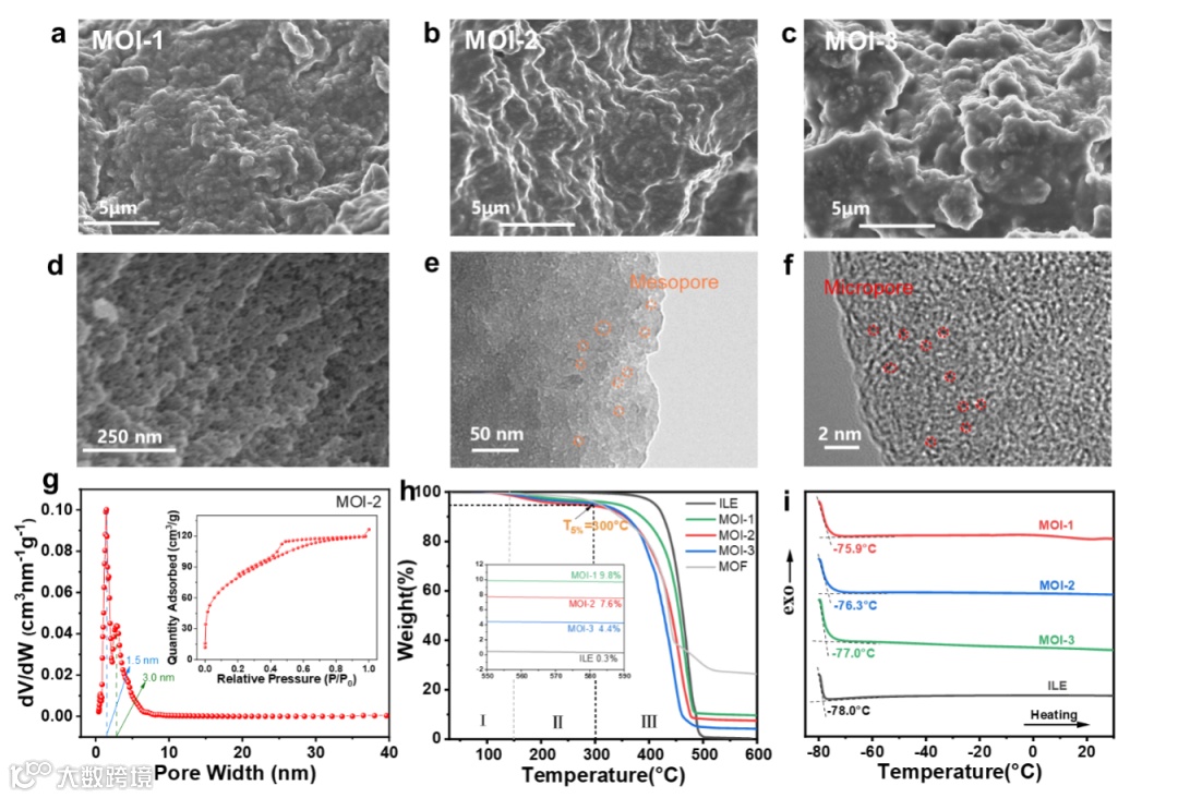 图 2. (a–c) 不同 MOI 的 SEM 图像;(d–f) MOI-2 骨架结构的 SEM 和 TEM 图像;(g) MOI-2 去除 ILE 后在 77 K 下的氮气吸附-脱附等温线及孔径分布;(h) 不同 MOI 与 ILE 的 TG 曲线;(i) 不同 MOI 与 ILE 的 DSC 曲线。