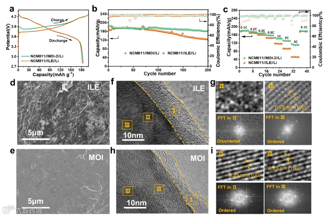 图 6. (a) NCM811/MOI-2/Li和NCM811/ILE/Li电池在0.1C倍率下的电压曲线;(b) NCM811/MOI-2/Li和NCM811/ILE/Li电池在0.1C倍率下的长循环性能;(c) NCM811/MOI-2/Li和 NCM811/ILE/Li电池倍率性能; (d, e) 循环后锂负极的SEM图像,(d) NCM811/ILE/Li电池,(e) NCM811/MOI-2/Li电池; (f–i) 循环200圈后 NCM811正极的TEM图像和FFT花样,(f, g) NCM811/ILE/Li电池,(h, i) NCM811/MOI-2/Li电池。
