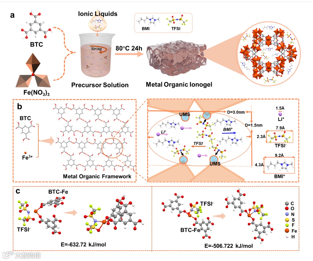 图 1. (a) MOI 合成路线示意图;(b) MOI 的结构组成与三维微孔结构;(c) UMS 与 TFSI⁻ 阴离子的计算结合能。
