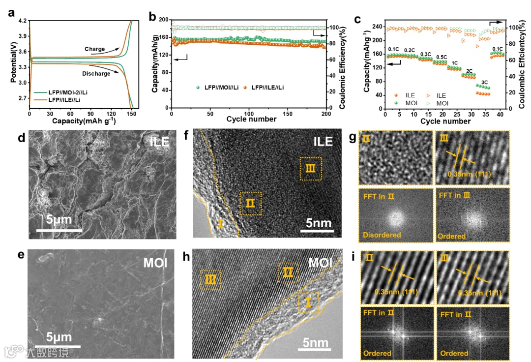 图 5. (a) LiFePO₄/MOI-2/Li和LiFePO₄/ILE/Li电池在0.1C倍率下的电压曲线;(b) LiFePO₄/MOI-2/Li和LiFePO₄/ILE/Li电池在0.1C倍率下的长循环性能;(c) LiFePO₄/MOI-2/Li和LiFePO₄/ILE/Li电池的倍率性能;(d, e) 循环后锂负极的 SEM 图像,(d) LiFePO₄/ILE/Li 电池,(e) LiFePO₄/MOI-2/Li 电池; (f–i) 循环 200 圈后LiFePO₄正极的TEM图像和FFT花样;(f, g) LiFePO₄/ILE/Li电池,(h, i) LiFePO₄/MOI-2/Li电池。