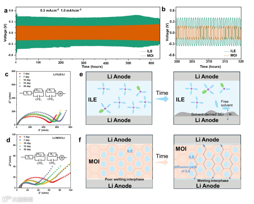图 4. (a, b) Li/MOI-2/Li和Li/ILE/Li对称电池在0.5 mA cm⁻²电流密度下的电压曲线;(a) 0–600 h全程曲线,(b) 300–320 h局部放大曲线;(c) Li/ILE/Li电池和 (d) Li/MOI-2/Li电池在25 °C下静置过程中的Nyquist图;(e) Li/ILE/Li和 (f) Li/MOI-2/Li电池界面阻抗演变示意图。