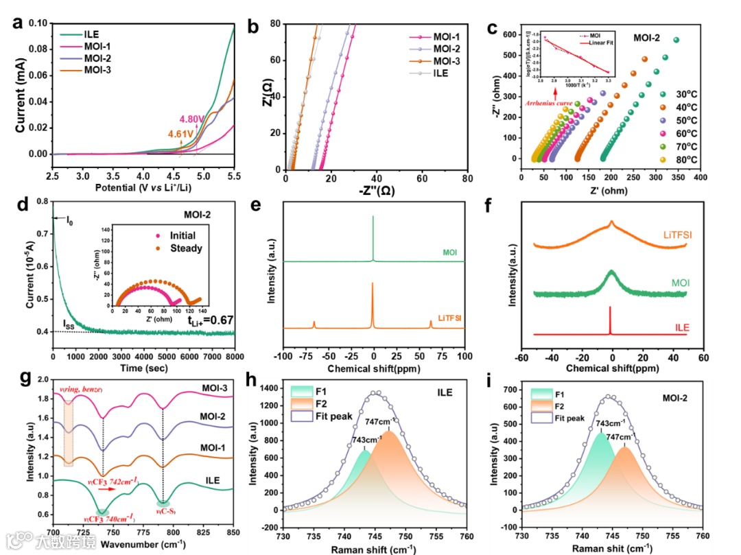 图 3. (a) MOI 与 ILE 的 LSV 曲线;(b) MOI 与 ILE 的 Nyquist 图;(c) MOI-2 在 30–80 °C 下的 Nyquist 图及 Arrhenius 图(内插图);(d) MOI-2 的计时电流 i–t 曲线与 EIS 谱图;(e) MOI-2 与 LiTFSI 的 ⁷Li MAS NMR 谱图;(f) LiTFSI、MOI 与 ILE 的静态 ⁷Li NMR 谱图;(g) MOI 与 ILE 的 FT-IR 谱图;(h–i) (h) ILE 和 (i) MOI-2 在 730–760 cm⁻¹ 范围内的拉曼光谱。