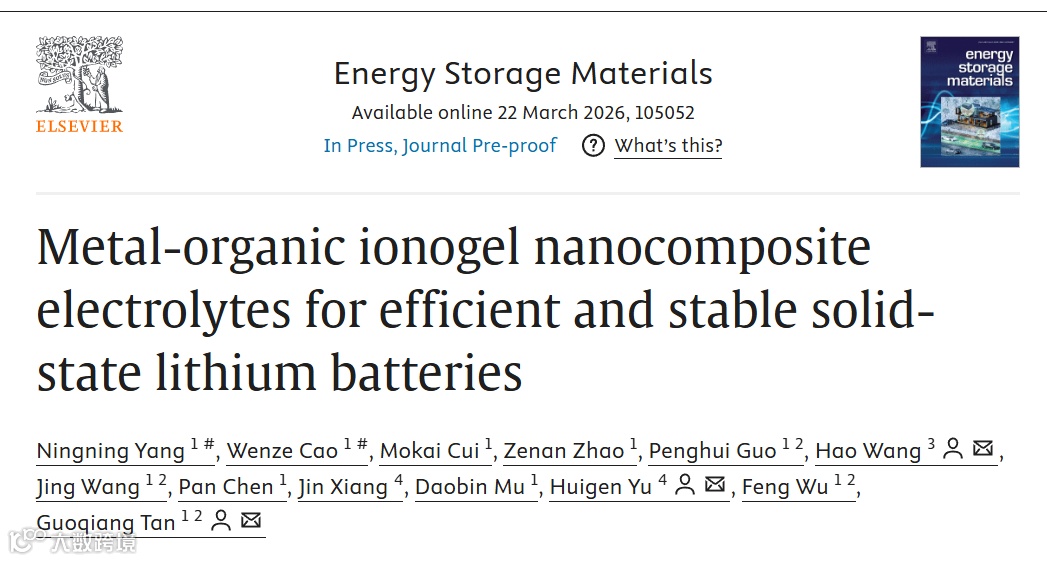 近日,北京理工大学谭国强教授团队在国际知名期刊《Energy Storage Materials》上发表题为“Metal-organic ionogel nanocomposite electrolytes for efficient and stable solid-state lithium batteries”的研究论文。在该项研究中,团队首次提出了“金属有机离子凝胶”新概念,通过一步溶胶-凝胶自组装法,将离子液体电解质原位限域于有序介孔金属有机框架中,成功构筑了一种兼具高离子电导率、宽电化学窗口与优异热稳定性的准固态电解质。经优化设计的金属有机离子凝胶呈现出均一稳定的玻璃态微观结构,在室温下表现出快速锂离子传导能力,同时显著改善了与锂金属负极的界面相容性,在LiFePO4//Li和LiNi0.8Co0.1Mn0.1O2//Li电池中均展现出高比容量和优异的循环稳定性。这种简单可扩展的溶胶-凝胶策略为准固态电解质的设计提供了一种全新思路,有望推动高能量密度固态锂金属电池的实用化发展。