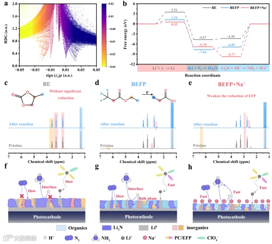 得益于新型多功能电解液中添加剂带来的协同调控效应,最终实现实现了SEI组成、结构与界面化学环境的全面优化,在正电位下建立了快速稳定的Li-Li+循环,为高效锂介导光电化学合成氨提供了可推广的界面调控策略。首先,EFP通过优先还原分解构建疏松多孔的有机/无机杂化SEI,打破传统致密无机SEI对传质的限制,为Li+快速脱溶剂化与传输提供了结构基础。其次,Na+通过特异性吸附于Li3N表面产生多重协同效应:一方面形成电子涡旋结构,将Li3N氢化能垒降至-9.77 eV,表观活化能降低26%;另一方面增强光电阴极表面电荷密度,内建电场提升至~0.47 kV·cm-1,优化质子传输动力学。第三,EFP与Na+在成分调控上形成互补平衡:EFP贡献有机组分构建疏松结构,Na+适度抑制EFP过度分解,避免活性锂消耗与界面失稳,实现有机/无机组分的优化配比与SEI结构的精准调控。