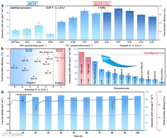 采用前期已验证的PdCu/CeO2/n+p-Si层级结构光电阴极,系统考察了EFP与Na⁺复合添加剂对锂介导PEC NRR性能的影响。性能测试表明,在0.16 mol·L-1 EFP与0.15 mol·L-1 Na+优化添加的BEFP+Na+电解液中,于3 MPa N2压力、0.55 V vs. Li/Li+电位及1倍太阳光照射下,体系实现了~93 μg·h-1·cm-2的氨产率与~67%的法拉第效率,过电位显著低于同类电化学体系;当光强增至2倍太阳光时,产率进一步提升至~109 μg·h-1·cm-2。100小时循环测试也表明体系具有良好的稳定性,界面反应处于持续调控。