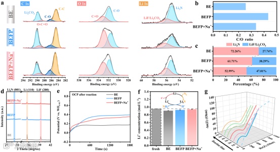 单一BE电解液中形成的SEI致密厚实,富含“死”锂,严重阻碍传质与Li-Li+循环。引入EFP与Na+后,SEI转变为薄且疏松多孔的有机/无机杂化结构,同时Li3N向NH3的转化效率从~23%提升至~68%,使Li3N生成与氢化动力学达到最佳平衡。电化学阻抗谱与开路电位测试进一步表明,该杂化SEI具有最低的离子传输阻抗和最优的质子传输动力学,促进了Li-Li+高效循环。证实了这种有机/无机平衡的多孔杂化SEI的构建是突破正电位下锂介导PEC NRR动力学瓶颈的关键策略。