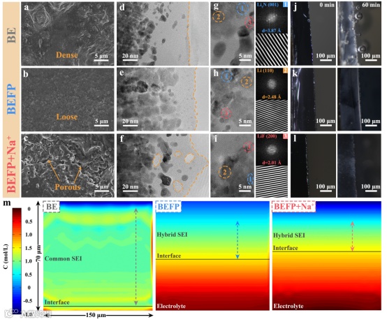 图4. 不同电解质中SEI的形态学与结构演化。