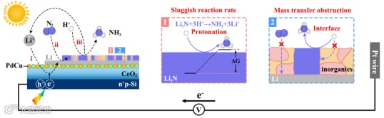 图1. 当前采用层级结构硅基光电阴极的锂介导PEC NRR 系统中反应路径及技术挑战。