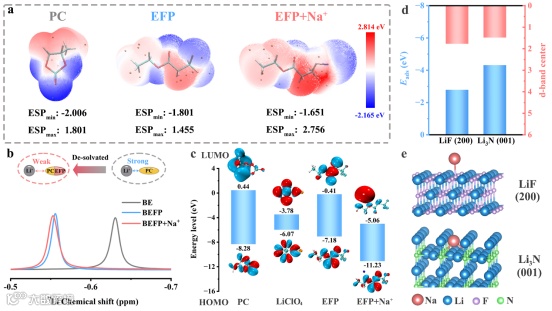 研究通过理论计算与实验相结合,系统设计并筛选了以EFP(3,3,3-三氟丙酸乙酯)和碱金属Na+为核心的复合电解质添加剂体系,用于调控锂介导PEC NRR中的SEI。EFP分子因具有较低的LUMO能级,可在光电阴极表面优先还原分解,与原始电解质共同构建有机/无机杂化SEI;Na+的引入进一步降低溶剂分子的LUMO能级,弱化Li+溶剂化结构,加速Li+脱溶与扩散。密度泛函理论(DFT)计算表明,Na+优先选择性吸附于关键中间体Li3N表面,吸附能显著低于其对LiF的吸附,从而调控Li3N的电子结构与界面微环境,降低其氢化能垒,促进NH3生成与Li+释放。该电解质设计策略为实现快速、稳定的Li-Li+循环提供了明确的SEI调控路径。