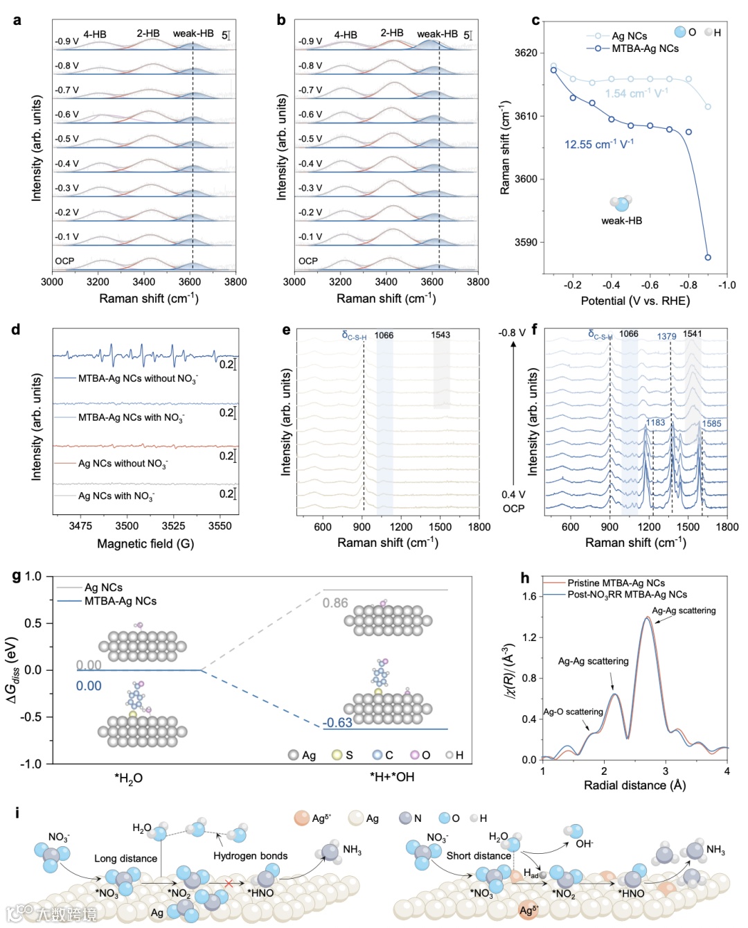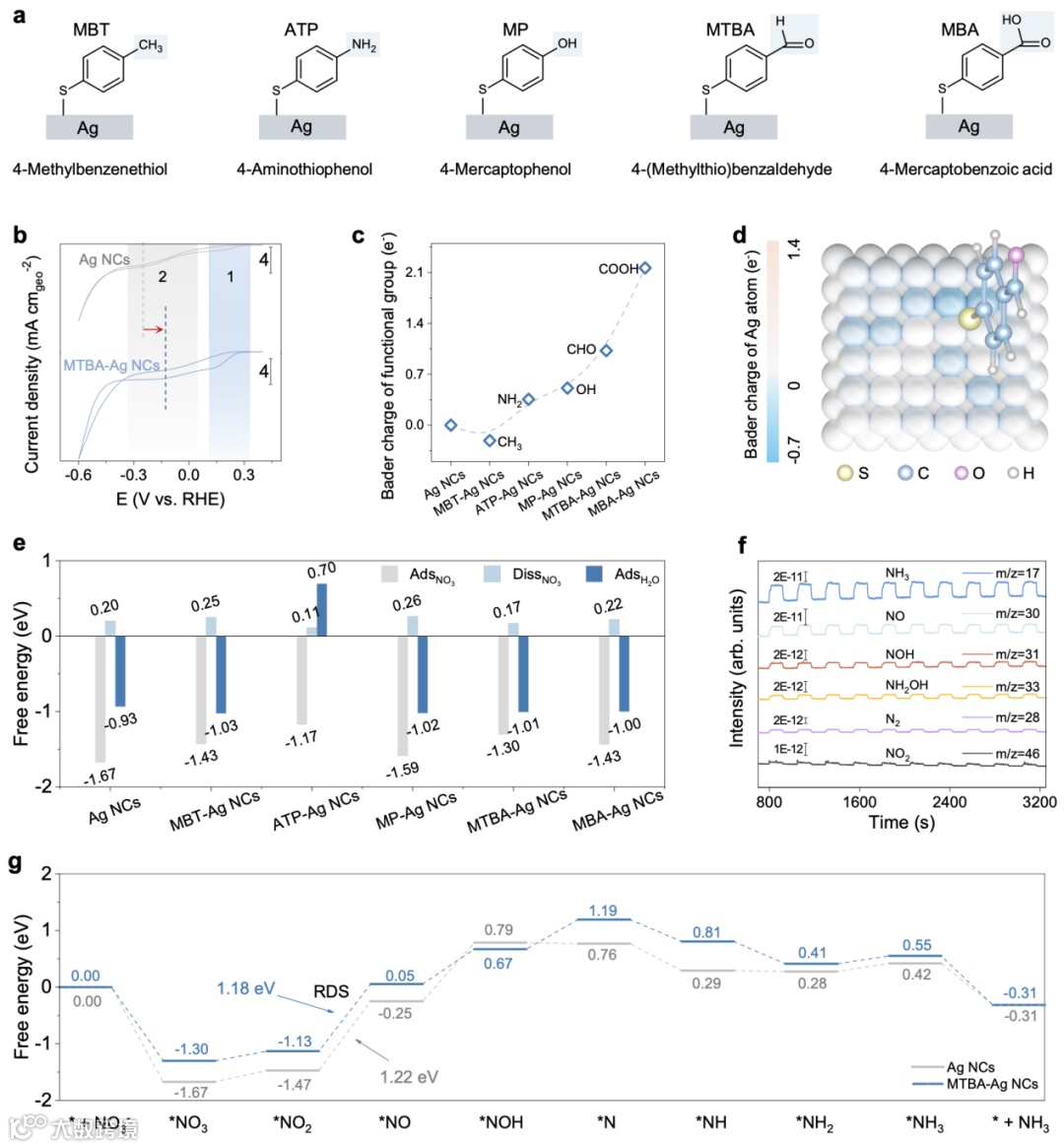 图4│ NO₃RR 过程中 Ag 纳米立方体与 MTBA-Ag 纳米立方体的反应机理研究