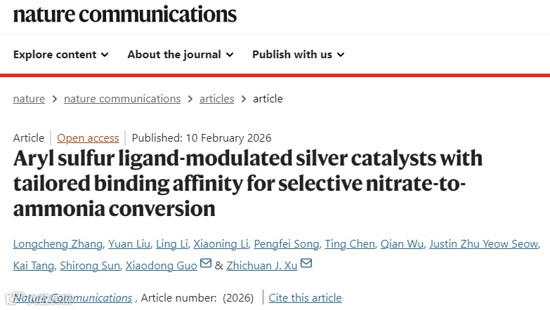 2026年2月10日,新加坡南洋理工大学徐梽川院士、四川大学郭孝东院长团队在Nature Communications期刊发表题为Aryl sulfur ligand-modulated silver catalysts with tailored binding affinity for selective nitrate-to-ammonia conversion的研究论文,张龙程、刘远、李玲为论文第一作者,徐梽川院士、郭孝东为论文共同通讯作者。