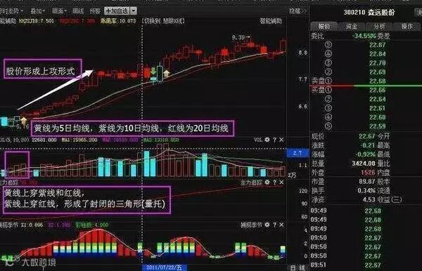 森远股份在长期下跌后,底部开始盘整。在2011年6月23日5日成交量均线上穿了10日成交量均线,第二天5日成交量均线上穿了20日成交量均线,6月28日10日成交量均线上穿了20日成交量均线,形成了一个封闭的三角形(量托),随后开始了一波底部反弹的行情。