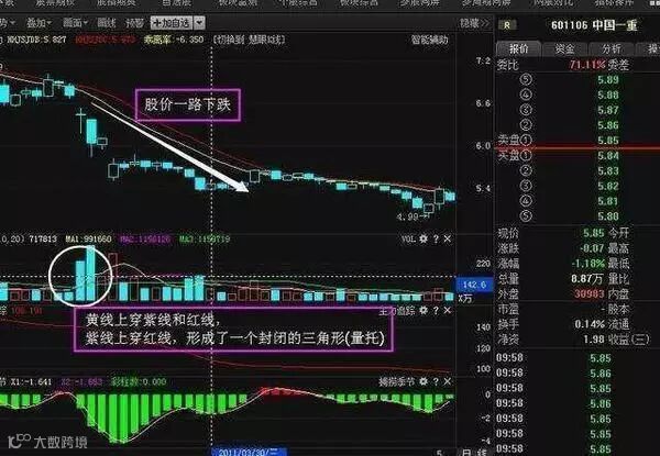 中国一重在一波拉升后开始了下跌。在下跌过程中于2011年3月11日5日成交量均线上穿10日成交量均线,3月14日5日成交量均线上穿20日成交量均线,3月15日10日成交量均线上穿20日成交量均线,形成了下跌通道中的“量托”预示着股价将要放量下跌。