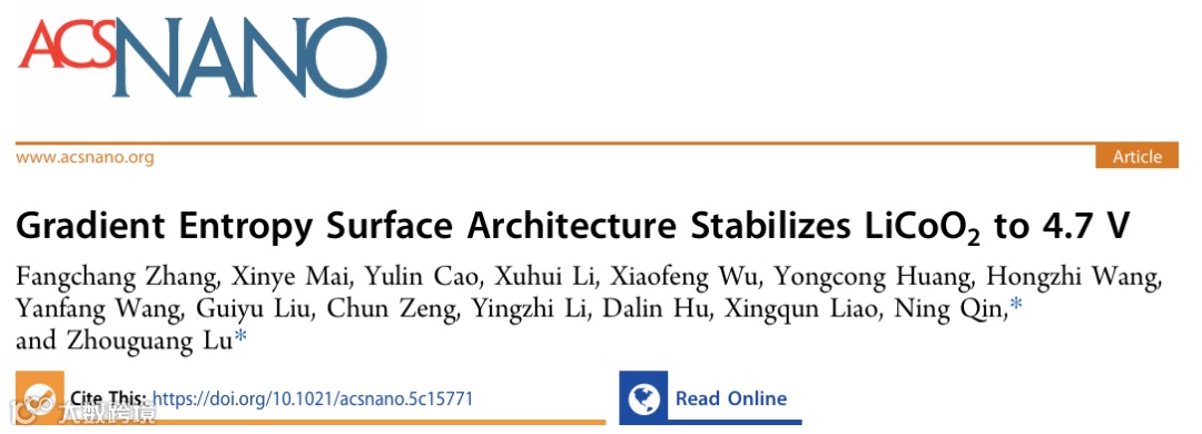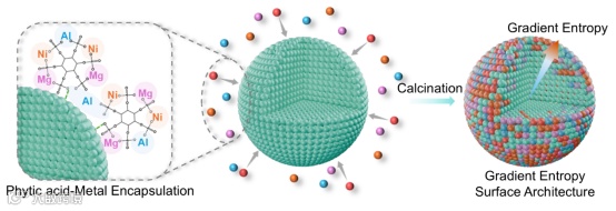 该工作提出“梯度熵(Gradient Entropy)表面结构”概念以提升LCO在 4.7 V 高电压下的结构与界面稳定性。作者利用植酸对多金属离子(Mg/Al/Ni)强螯合的化学特性,在LCO表面构建超薄均一的包覆层。经高温煅烧后,多种元素发生由表及里的扩散与梯度分布,从而形成“外层高熵—内层低熵”的近表面结构。该设计意在通过高熵效应降低表面Gibbs自由能并提高热力学稳定性,同时保留体相相对低熵结构以维持电化学活性,从而实现高电压窗口下的综合性能提升。文中报告 GE-LCO 在 4.7 V 下获得 0.1C 容量 230.9 mAh g⁻¹,并在循环稳定性方面较对照样品表现更优。