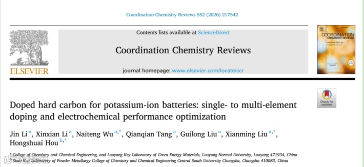 本文为发表于国际知名期刊Coordination Chemistry Reviews的钾离子电池硬碳负极改性专题综述,由洛阳师范学院刘献明教授与中南大学侯红帅教授共同通讯,李进为第一作者。文章围绕钾离子电池用掺杂硬碳展开系统综述,聚焦单元素掺杂向多元素掺杂的发展历程,全面梳理了B、N、O、P、S等单元素掺杂,N/B、N/O、N/P 等双元素掺杂,以及 N/P/S、N/O/P、N/O/S 等三元素掺杂硬碳的设计策略、制备方法与改性机制(图 1)。