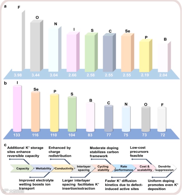 图 1. 单元素至多元素掺杂硬碳及钾离子电池电化学性能优化