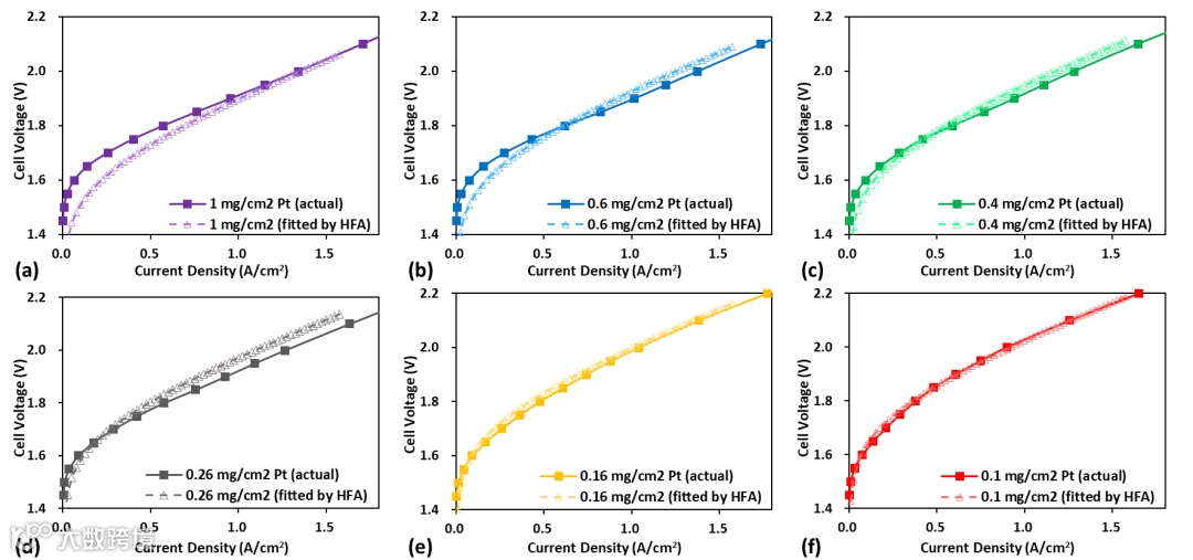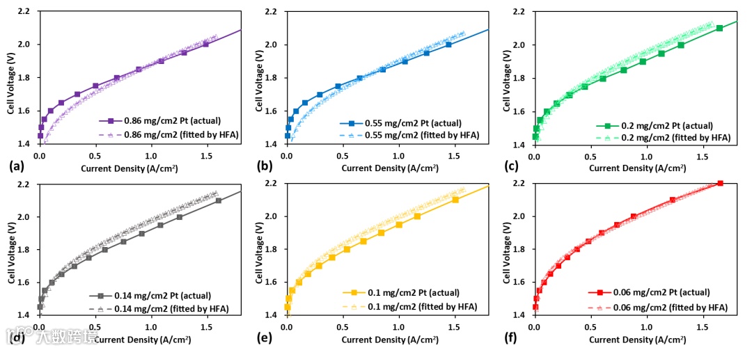 图7. 采用高场近似(HFA)方法得到的高比表面积催化剂(HSAC)膜电极组件(MEA)在不同铂载量下的实验(实测)极化曲线与拟合极化曲线对比:(a) 0.86 mgPt cm-²、(b) 0.55 mgPt cm-²、(c) 0.2 mgPt cm-²、(d) 0.14 mgPt cm-²、(e) 0.1 mgPt cm-²、(f) 0.06 mgPt cm-²。