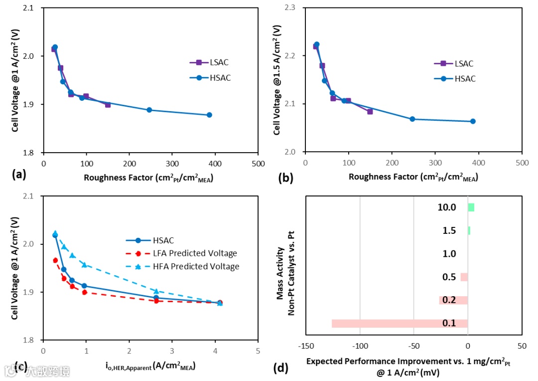 图8. LSAC 与 HSAC 催化剂在(a) 1 A cm-²、(b) 1.5 A cm-² 电流密度下粗糙度因子(RF)与电池电压的关系;(c) 表观析氢反应交换电流密度 io,HER,Apparent 与 1 A cm-² 电流密度下电池电压的关系;(d) 1 A cm-² 电流密度下相对 1 mgPt cm-² 的预期性能差值与相对铂的质量活性提升幅度之间的关系。