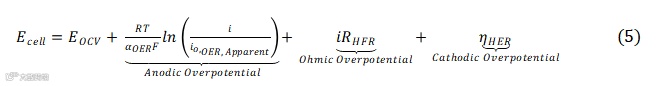 基于以上关系,本研究推导得到简易性能模型公式(5),Ecell为电解池工作电压,EOCV为开路电压。所有分析中,阳极层与膜均保持不变,因此阳极过电势与欧姆过电势的模型输入参数保持恒定。ηHER为阴极析氢过电势。