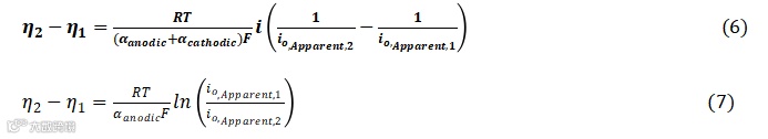 在对基准 1 mgPt cm-² 数据完成初始拟合后,假定 io,HER(A cm-²Pt)保持恒定,在低场近似(LFA)或高场近似(HFA)假设下,对比参比体系(io,Apparent,1)与新体系(因载量、ECSA 乃至本征电流密度 io,real 改变而得到 io,Apparent,2)之间预期的过电势变化,该式分别可由式(3)、(4)直接推导得到LFA模型公式(6)与HFA公式(7):