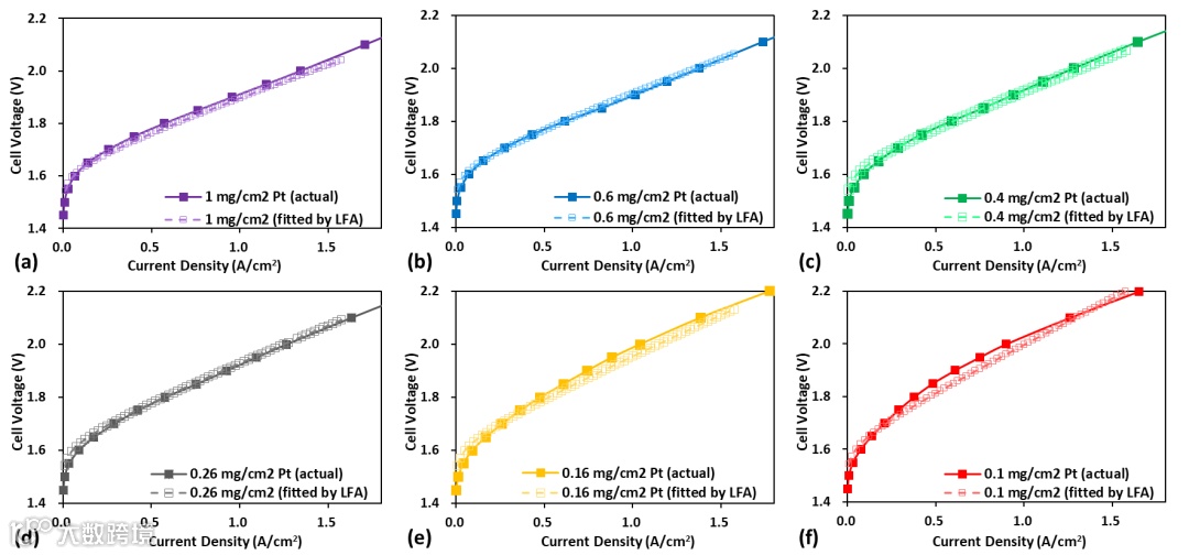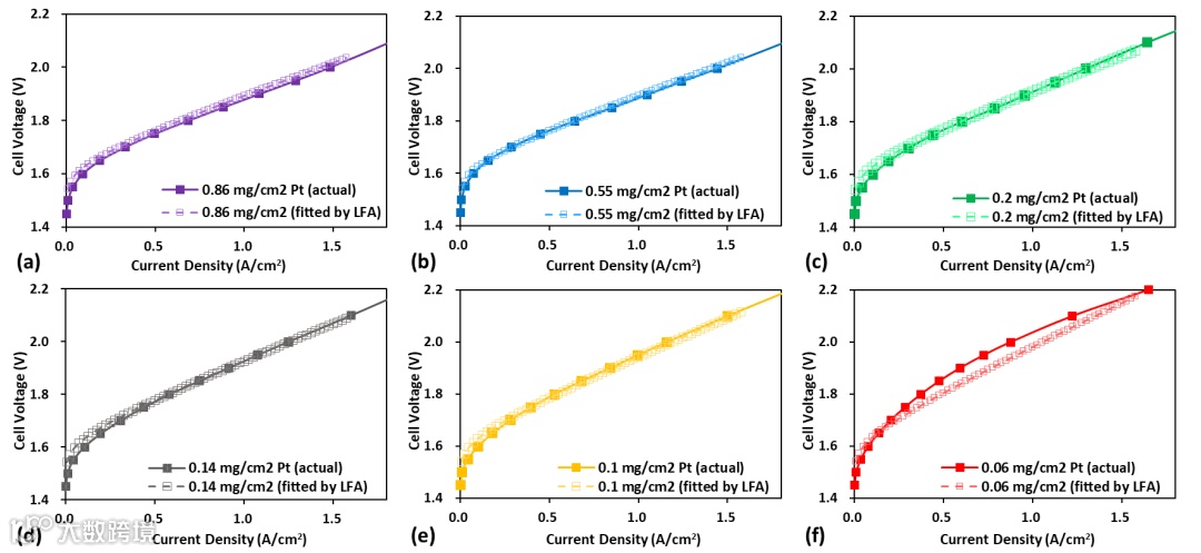 图4. 采用低场近似(LFA)方法对不同铂载量的低比表面积催化剂(LSAC)膜电极组件(MEA)进行拟合:(a) 1 mgPt cm-²、(b) 0.6 mgPt cm-²、(c) 0.4 mgPt cm-²、(d) 0.26 mgPt cm-²、(e) 0.16 mgPt cm-²、(f) 0.1 mgPt cm-² 的实验(实测)极化曲线与拟合极化曲线对比。