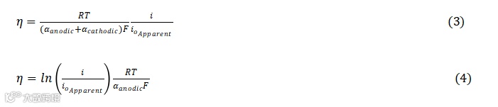 由于式(1)无法对η进行显式求解,通常根据电极极化程度的高低采用两种简化形式。在低极化条件下(低场近似,LFA)得到式(3);与之相对,当η绝对值足够大时(无论正负),BV方程中的一个指数项可忽略,即高场近似(HFA),得到式(4)。如下所示:
