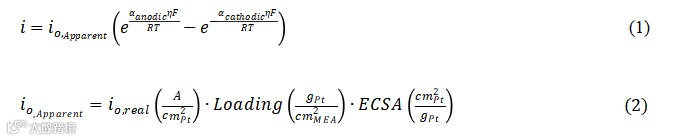 为了更深入地探究这一结果,在标准Butler-Volmer(BV)动力学的基础上进行阴极过电位的模型分析(式(1))。其中唯一区别在于采用了表观交换电流密度(io, Apparent);这样表达的原因是极化曲线测试中电流的单位为 A cm-²MEA,而非A cm-²Pt,两者关系如式(2)所示。式中,αanodic 和 αcathodic分别代表阳极传递系数与阴极传递系数。