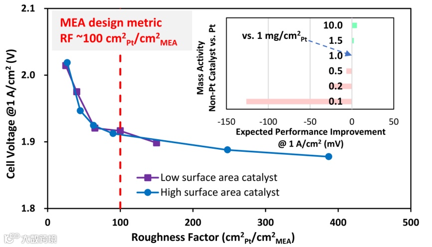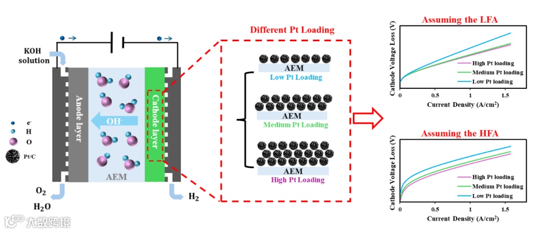 图1. 基于Butler-Volmer equation (BV)方程建立的AEMWE 阴极Pt载量与阴极电压损失的关系图,展示LFA vs. HFA模型差异。