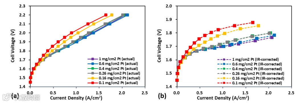 图3. (a)采用LSAC的MEA在不同Pt载量时的极化曲线与(b)IR 校正后的极化曲线。