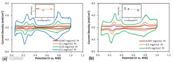 图2. RDE测试不同载量的(a)LSAC的CV曲线和ECSA结果(插入的小图)(b)HSAC LSAC的CV曲线和ECSA结果(插入的小图,1 mol L-1 KOH 溶液)。插图中红色虚线代表ECSA的平均值。
