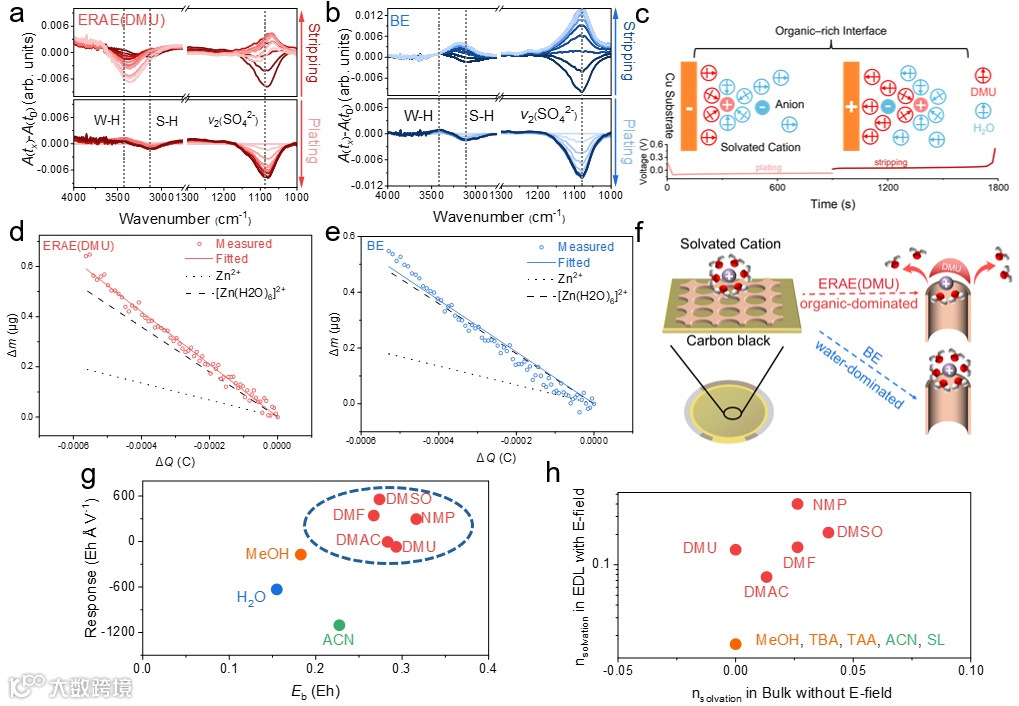 为了深入探究电场驱动下的界面演变过程,本工作结合了原位电化学石英晶体微天平(eQCM)与红外光谱(ATR-FTIR)等先进表征技术 。eQCM 的质量-电荷分析直观地显示,在施加运行电场后,界面处锌物种的表观摩尔质量达到了 202 g mol-1,这显著高于纯水合锌离子的理论值(179 g g mol-1)。证实了 DMU 分子在电极表面发生了主动定向迁移与富集,并直接参与了界面配位,形成了更重、更稳定的复合物。