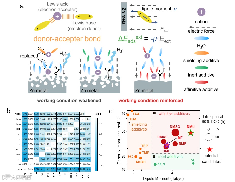 打破传统“静态”经验试错的局限,本研究首次提出了基于分子“给体数(DN)”和“偶极矩(μ)”的双参数筛选模型。以筛选出的N,N-二甲基脲(DMU)为例,其高DN保证了与 Zn²⁺ 的强配位,高μ使其能响应电场快速极化,仅需极低添加量(2 wt%)即可构建“电场增强亲和性电解液(ERAE)”。