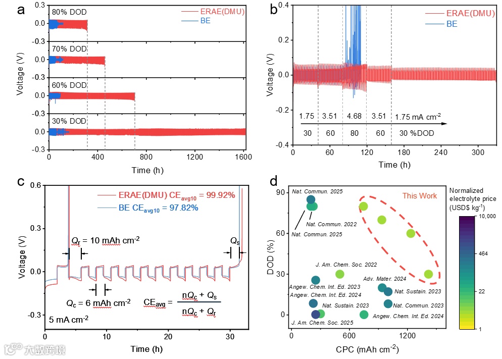 同时 ,原位红外光谱进一步揭示了这种动态富集对双电层结构的重构作用。在镀锌过程中,界面处水分子和硫酸根的红外吸收变化被显著抑制,这表明 DMU 的界面吸附有效排斥了这些破坏性组分。两者结合,充分证明了该策略从根本上抑制了水合锌离子的脱溶剂化副反应与析氢腐蚀,成功构建出了一个贫水且高度安全的界面环境。