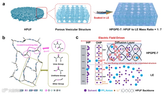 图1. HPGPE-7的设计原理:示意了(a) HPGPE-7的制备过程,(b) HPUF骨架结构,以及(c) HPGPE-7与液态电解液(LE)形成的双层结构,其中标示了内亥姆霍兹平面(IHP)、外亥姆霍兹平面(OHP)和扩散层。