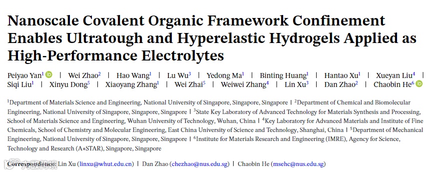 近日,新加坡国立大学何超斌教授、赵丹教授、武汉理工大学徐林教授合作,在 Advanced Science 上发表题为 “Nanoscale Covalent Organic Framework Confinement Enables Ultratough and Hyperelastic Hydrogels Applied as High-Performance Electrolytes” 的研究论文。该工作提出了一种基于纳米 COF(nCOF) 的限域聚合策略,通过在 nCOF 有序纳米孔道内引导聚合物链穿线和缠结,成功突破了传统水凝胶在强度、韧性和弹性之间难以兼得的瓶颈。所得单网络水凝胶强度由 0.3 MPa 提升至 3.2 MPa,韧性由 7.5 MJ m⁻³ 提升至 186–196 MJ m⁻³,断裂能由 0.8 kJ m⁻² 提升至最高 14.7 kJ m⁻²,并在 2000% 拉伸应变、100 次循环 后依然保持极低滞后和约 93% 能量恢复率。进一步地,该超韧超弹水凝胶还被用作高性能准固态锌离子电池电解质,表现出优异的抗枝晶穿刺能力和长循环稳定性。