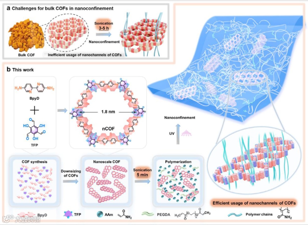 近年来,纳米限域策略被认为是调控软材料力学行为的重要方法。共价有机框架材料(COFs)具有有序纳米孔道、可调化学结构和刚性骨架,为在聚合物网络中实现限域聚合提供了新思路。但传统块体 COF(bCOF)通常尺寸较大、易聚集、孔道利用率低,难以真正发挥纳米限域增强作用。因此,如何通过结构设计充分利用 COF 的纳米孔道,实现水凝胶强度、韧性与弹性的协同提升,仍是该领域的重要挑战。