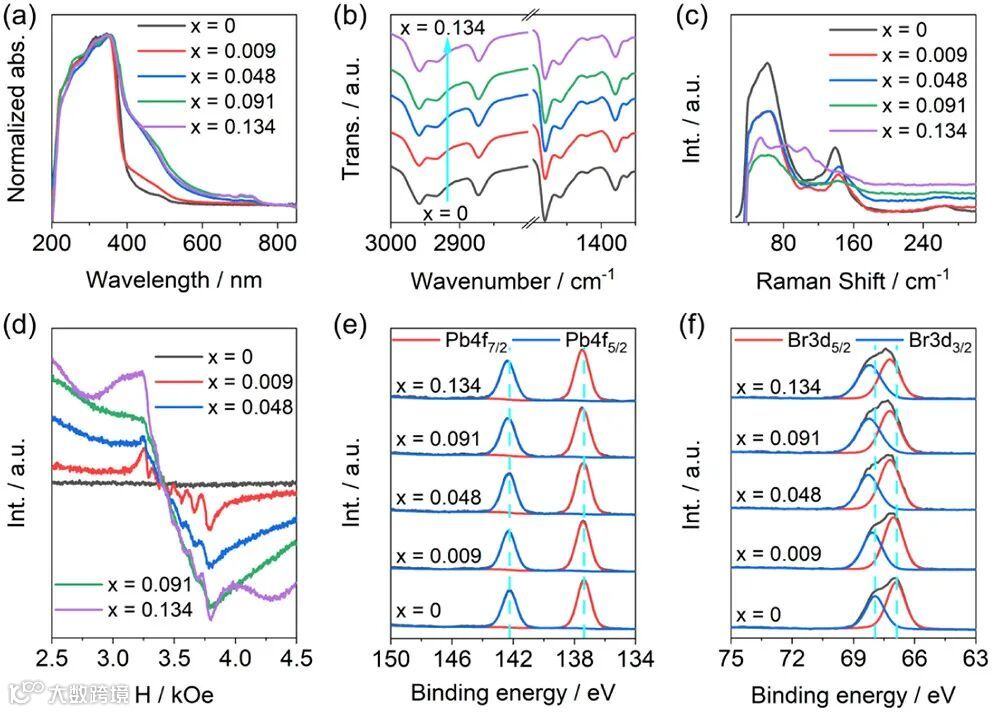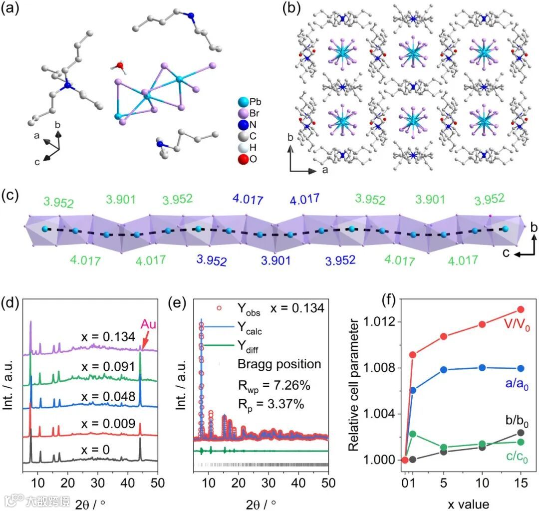 研究团队首先合成了母体材料TBA0.8(H3O)0.2PbBr3。单晶结构分析显示,该材料由一维无限延伸的{PbBr3}∞无机链构成,体积较大的TBA+阳离子填充于无机链之间。A位存在一定比例阳离子空位,同时晶格中含有H3O+,这些结构特征为离子迁移提供了潜在通道。在此基础上引入Li+与Mn2+共掺杂。由于离子尺寸差异,晶格发生膨胀并产生额外自由体积,为离子扩散提供了更宽裕的迁移路径。