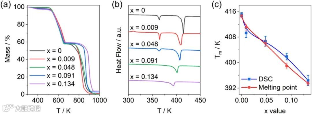 交流阻抗谱测试显示,材料在303–373 K范围内表现出典型的热激活离子导电行为。未掺杂样品室温电导率仅约10-9 S cm-1。随Li+/Mn2+掺杂量增加,电导率显著提高。最优组分x = 0.134在373 K下电导率达3.75 × 10-3 S cm-1。Arrhenius拟合表明离子迁移活化能从1.94 eV降至0.88 eV,证实尺寸失配合金化显著降低了离子迁移势垒。