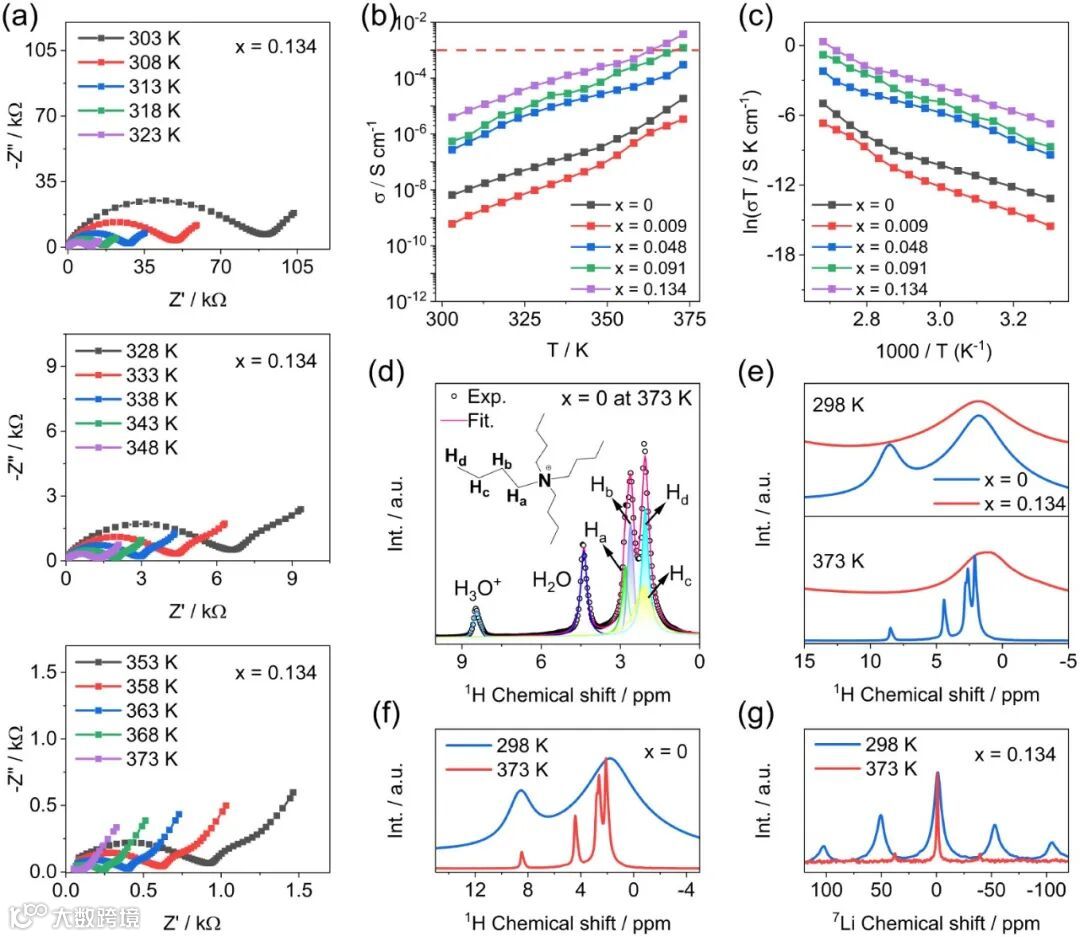 ¹H与⁷Li固态核磁共振研究表明,高导电样品中Li+迁移占主导,同时仍存在质子传导贡献。综合分析表明,材料离子导电源于H+与Li+的协同迁移:Li+掺杂扩大晶格自由体积,H₃O +提供质子来源,二者协同显著提升了整体离子导电性能。