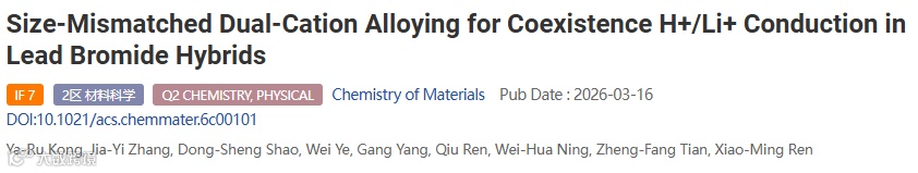 南京工业大学任小明教授、邵冬生博士团队与黄冈师范学院田正芳教授团队合作,提出一种尺寸失配双阳离子合金化策略,在一维溴化铅杂化体系中实现了H+与Li+的协同传导。该方法通过调控晶格自由体积有效降低离子迁移能垒,使材料在373 K下的离子电导率达3.75 × 10-3 S cm-1,为分子基离子导体的结构设计提供了新思路。