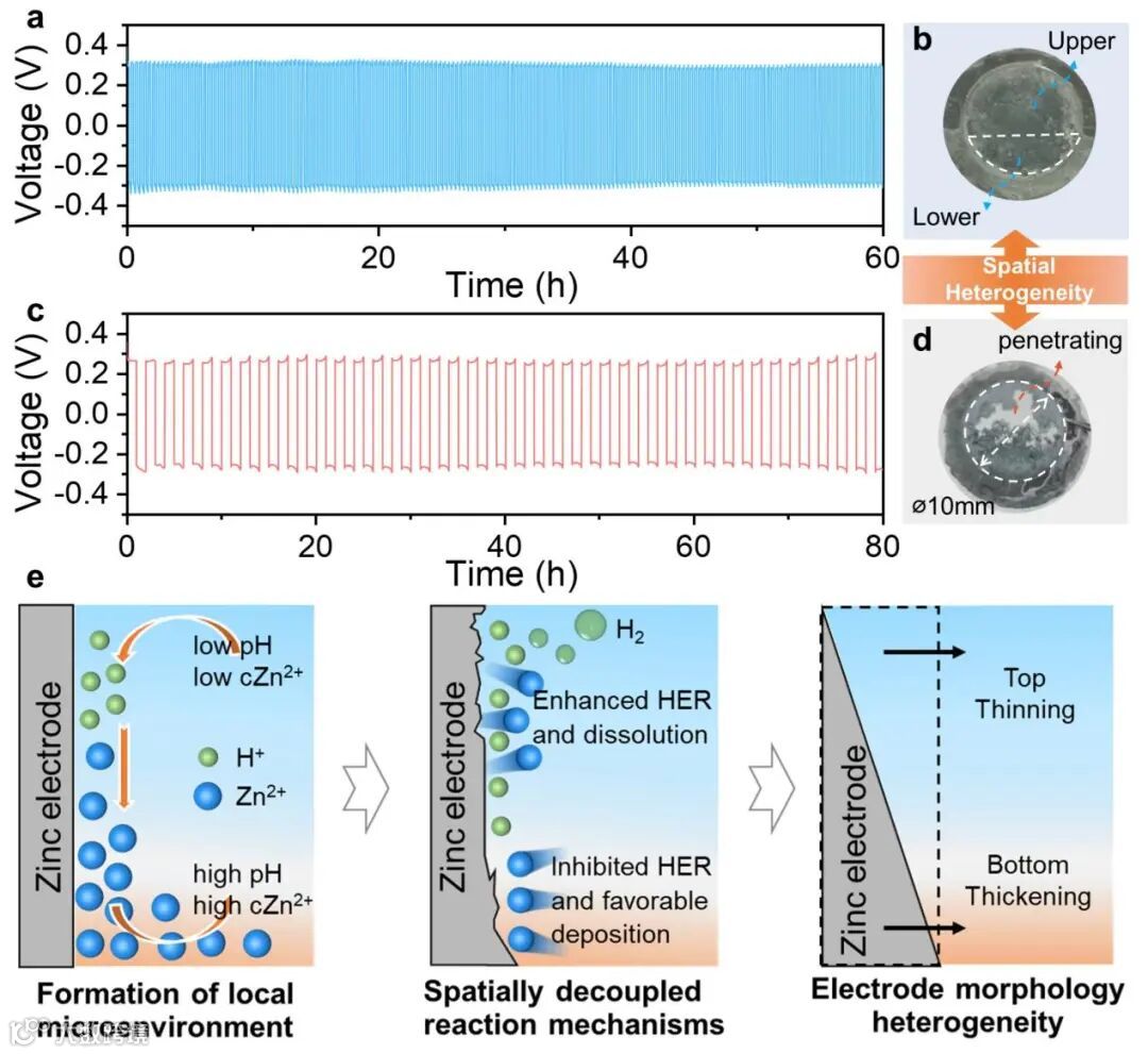 图4系统揭示了界面化学微环境对锌电极宏观结构演化的影响。为更接近实际水系电池的运行状态,研究团队采用电极竖直放置的对称锌电池构型。在该构型下,以10 mA cm–2电流密度进行循环测试,单个剥离/沉积工步为10 min。结果显示,电池在长期循环过程中电压曲线保持相对稳定,但循环后的锌电极已在竖直方向出现明显结构分化。当进一步将单个工步延长至1 h时,这种结构差异更加显著,上部锌层在多次循环后被逐渐消耗甚至发生局部剥穿,而下部区域则持续富集活性物质。可以看出,电池形成的竖直化学梯度导致电极上下区域出现不同的反应环境:上部区域处于低pH、低Zn2+浓度环境,易发生析氢和腐蚀溶解;而下部区域则处于高pH、富Zn2+环境,更有利于锌沉积。随着循环的不断进行,这种空间解耦的反应路径持续累积并逐渐放大,最终导致锌电极沿竖直方向出现明显的形貌异质性甚至局部失效,揭示了界面化学梯度驱动的电极退化新机制。