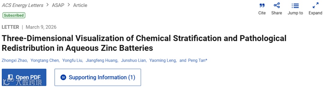 Zhongxi Zhao#, Yongtang Chen#, Yongfu Liu, Jiangfeng Huang, Junshuo Lian, Yaoming Leng, and Peng Tan*. Three-Dimensional Visualization of Chemical Stratification and Pathological Redistribution in Aqueous Zinc Batteries. ACS Energy Letters, 2026,
