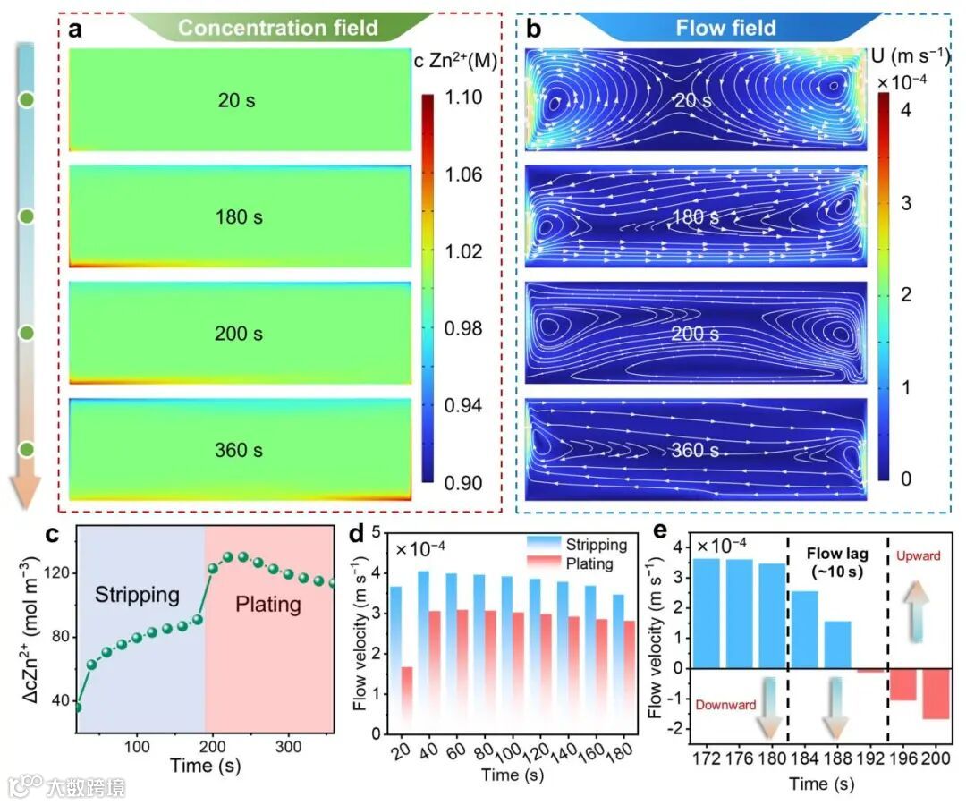 图3通过多物理场耦合模型对实验中观测到的界面竖直pH梯度形成机制进行了定量解析。模型几何尺寸与原位可视化电池构型一致,并同时考虑扩散、对流与电迁移三种传输机制。模拟结果显示Zn2+浓度在电极附近呈现显著的竖直异质分布:在溶解阶段,电极底部Zn2+浓度持续高于顶部,至180 s时上下浓度差达到约90.1 mol m–3;在随后沉积阶段初期,该差值进一步增加至约130.0 mol m–3,并在循环结束时仍保持在约113.8 mol m–3。浓度差导致了电解液密度产生空间分层,从而诱导浮力驱动的自然对流,在电解液内部形成明显的流场结构。在溶解阶段,左侧电极界面因密度增加,在重力作用下引发强烈的向下沉降流;在沉积阶段,左侧电极界面因密度减小形成向上的浮力流,右侧则相反。进一步的动力学分析,揭示了流场具有明显的非对称性与惯性滞后效应,使得底部富集的高Zn2+浓度、高pH电解液难以被完全消除。因此,竖直pH梯度一旦形成便具有高度的稳定性和不可逆性,并导致了后续的活性物质再分布与电极失效。