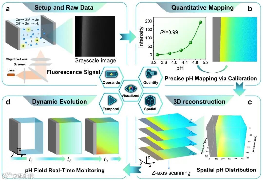 图1展示了原位三维荧光pH可视化平台的构建原理。研究团队设计了一种可进行光学观测的电化学测试装置,并在电解液中引入荧光pH指示剂,通过激光共聚焦成像技术逐层扫描界面附近电解液区域,实现了反应界面pH场在三维空间中的实时监测与高精度定量重构。从二维平面迈向三维空间的一个技术壁垒在于纵向信号衰减,导致深层区域的信噪比急剧下降。为此,研究团队创新开发了动态激光补偿技术,使激发光强度随扫描深度(Z 轴)同步线性增加,以抵消光路传输损耗。基于上述硬件优化,研究团队进一步建立了一套标准化的数据解析流程,涵盖原始信号采集、定量数值映射、三维空间重构以及动态演变监测四个关键维度,保证了能够直观地捕捉到电化学反应过程中空间pH场随时间的演化细节,为揭示电极动态失效机制提供了不可替代的可视化证据。