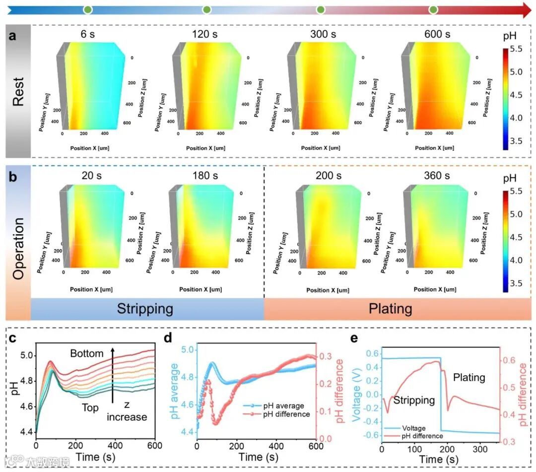 水系锌电池(AZBs)凭借其本征安全、低成本与环境友好等优势,在下一代大规模储能中表现出巨大潜力。然而,金属锌负极在水系电解液中的界面不稳定性严重阻碍了其商业化进程,枝晶生长、析氢副反应、表面钝化及自腐蚀等问题相互耦合,导致电池循环寿命远低于理论预期。事实上,这些失效行为均受控于电极/电解液界面局部化学微环境,尤其是质子活性(即局部pH)的动态演化。局部酸化环境易诱发活性锌的化学腐蚀并加剧析氢反应,而局部碱化则促进碱式硫酸锌或氧化锌等绝缘副产物的生成,导致界面钝化和不均匀沉积。界面pH并非被动响应变量,而是直接决定锌负极反应选择性与演化方向的核心参数。因此,发展能够原位捕捉界面化学环境三维演化过程的表征方法,并深入理解其对电极稳定性的影响,对于揭示水系锌电池的失效机制以及提高电池性能具有重要意义。