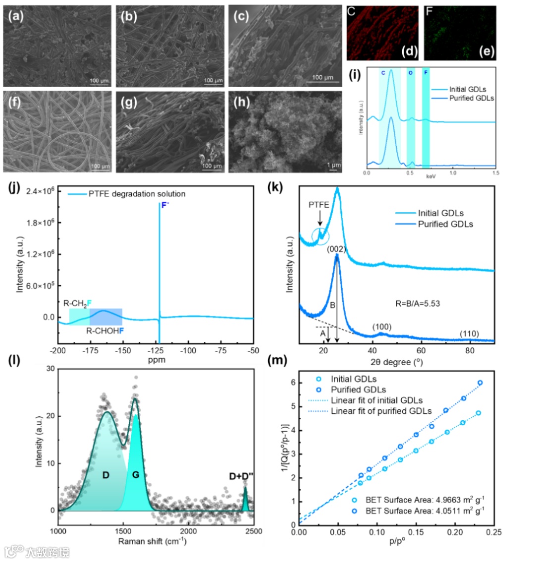 图二. GDL 的表征与纯化过程。初始 GDL 外侧(a)、内侧(b)以及横截面(c)的扫描电子显微镜图像。初始 GDL 的 EDS 映射信号中的碳(d)和氟(e)。纯化后的 GDL 表面(f)和横截面(g)的扫描电子显微镜图像。(h)由聚四氟乙烯降解产生的碳的扫描电子显微镜图像。(i)初始和纯化后的 GDL 的 EDS 映射光谱。(j)聚四氟乙烯降解所得收集溶液的 19F 核磁共振光谱。(k)初始和纯化后的 GDL 的 XRD 光谱。(l)纯化后的 GDL 的拉曼光谱。(m)初始和纯化后的 GDL 的 BET 表面及其拟合数据。