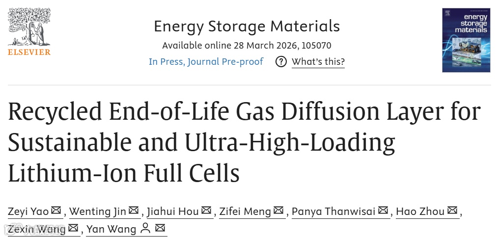 近日,来自伍斯特理工学院的王岩教授及其研究团队,在国际知名期刊Energy Storage Materials上发表题为“Recycled End-of-Life Gas Diffusion Layer for Sustainable and Ultra-High-Loading Lithium-Ion Full Cells”的研究文章。该文章提出了一种合理回收氢燃料电池的废旧气体扩散层(GDL) 的方法,并利用其三维导电结构实现了高负载、高能量密度的锂离子全电池。